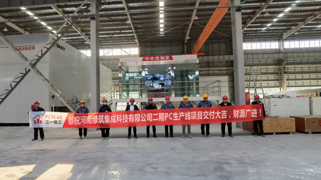The first PC production line of Henan Green Building has been put into operation in 2021, and the second PC production line put into operation this time will have an annual production capacity of 100,000 cubic meters. Under the condition that the Sany professional installation team worked overtime and took into account the quality assurance, the installation and delivery of the equipment of the second phase of the PC production line was shortened by 42% compared with the original schedule, and the installation efficiency was the highest in the industry. At the project site, representatives of Sany Construction Engineering and Henan Lvzhu customers pulled up the banner of "Congratulations to Henan Lvzhu Integrated Technology Co., Ltd. on the delivery of the second phase of the PC production line project and the wide progress of financial resources", and took a group photo.